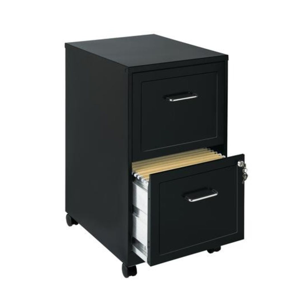 Archivero vertical de 2 cajones de carga ligera acabado en pintura electrostática color negro, cajones para tamaño carta, jaladeras cromadas cerradura para ambos cajones soporta de 10 a 15 kg de papel por gaveta, incluye ruedas